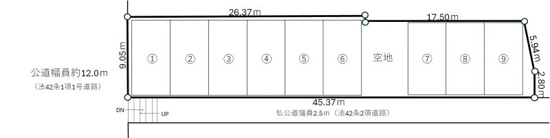 角地 西 間口9m 公道 幅12m 南 間口45.3m 私道 幅2.5m |