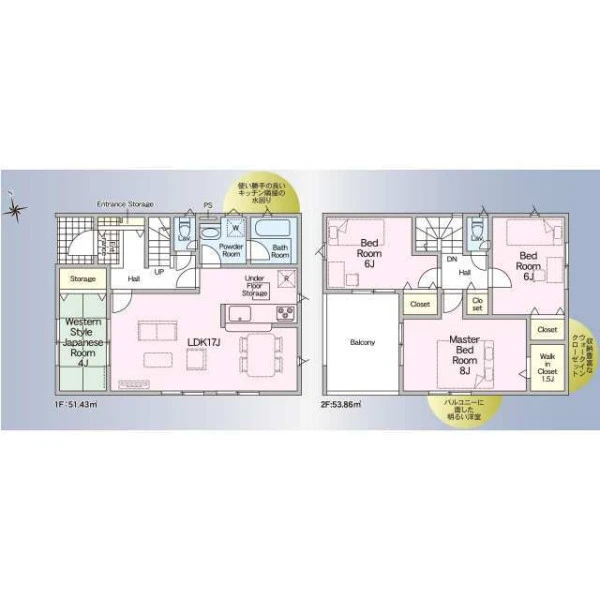 | 設備 | ガスその他、電気、上水道、下水道、システムキッチン、カウンターキッチン、浄水器、IHクッキングヒーター、給湯、トイレ2箇所、温水洗浄便座、シャンプードレッサー、浴室乾燥機、フローリング、複層ガラス、ルーフバルコニー、オール電化、収納スペース、ウォークインクローゼット、床下収納、駐車2台可、ディンプルキー、モニタ付インターホン、火災警報器等設置済、建設住宅性能評価取得(予定含む) | ||