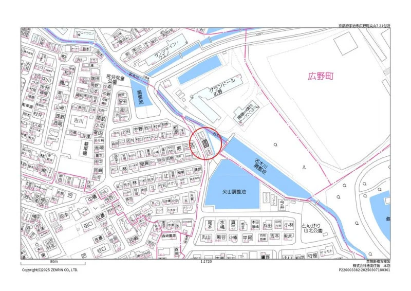 ※地図上の「対象地」は「京都府宇治市広野町尖山 」付近を示しています。実際の場所ではない場合がございます。詳しくはお問い合わせください。