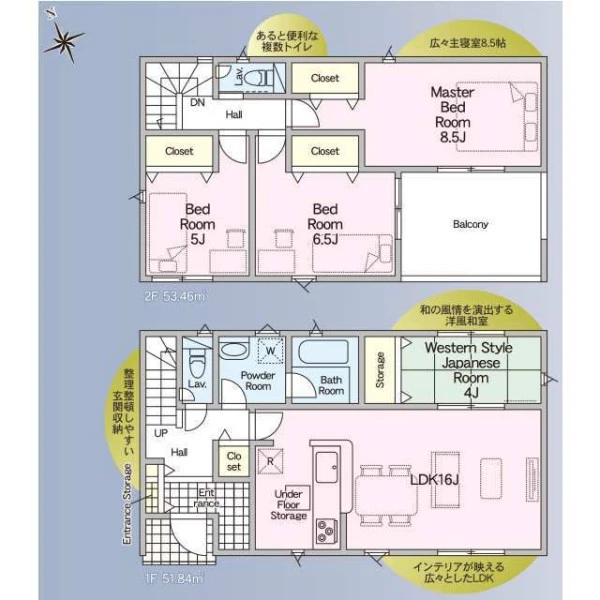 | 設備 | 都市ガス、電気、上水道、下水道、システムキッチン、カウンターキッチン、浄水器、給湯、トイレ2箇所、温水洗浄便座、シャンプードレッサー、浴室乾燥機、フローリング、複層ガラス、ルーフバルコニー、収納スペース、床下収納、ディンプルキー、モニタ付インターホン、火災警報器等設置済、建設住宅性能評価取得(予定含む) | ||