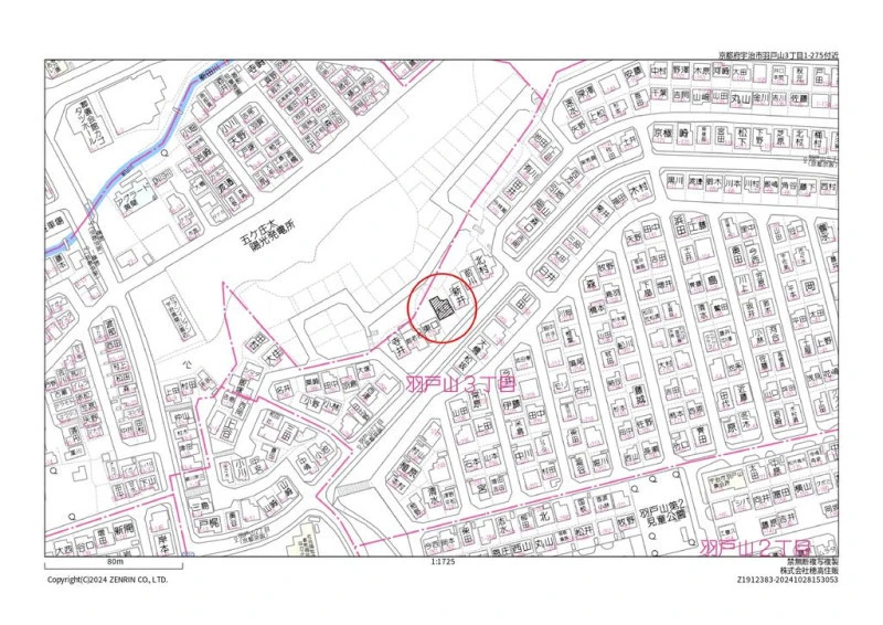 ※地図上の「対象地」は「京都府宇治市羽戸山3丁目 」付近を示しています。実際の場所ではない場合がございます。詳しくはお問い合わせください。