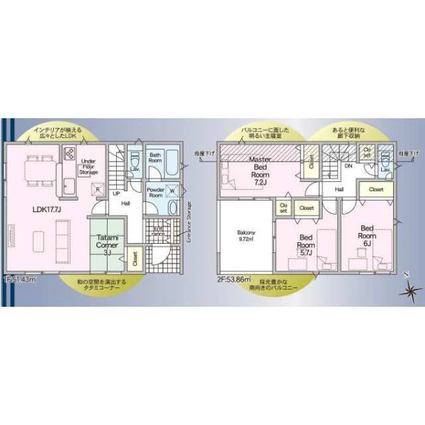 | 設備 | 都市ガス、電気、上水道、下水道、システムキッチン、カウンターキッチン、浄水器、給湯、トイレ2箇所、温水洗浄便座、シャンプードレッサー、浴室乾燥機、フローリング、複層ガラス、ルーフバルコニー、収納スペース、床下収納、駐車2台可、ディンプルキー、モニタ付インターホン、火災警報器等設置済、建設住宅性能評価取得(予定含む) | ||