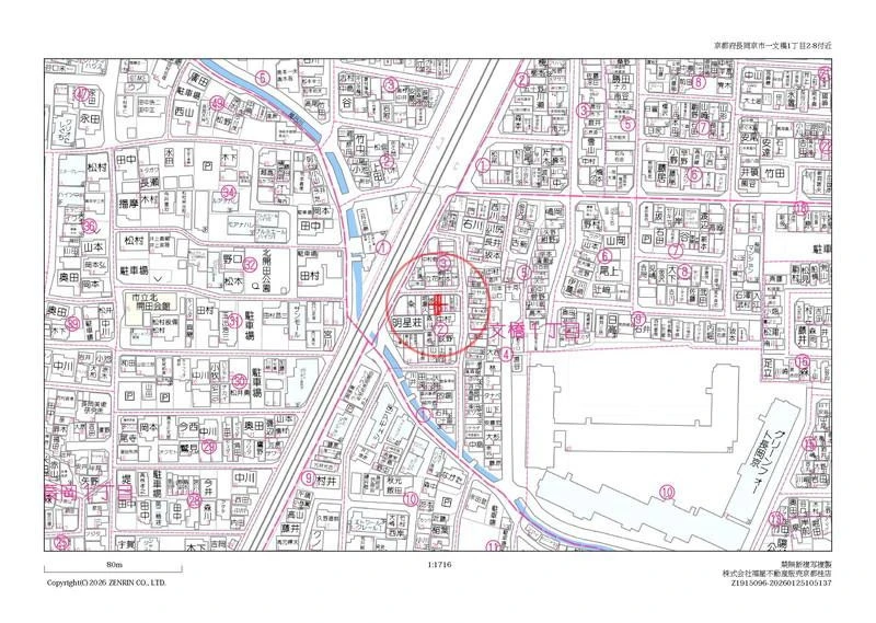 ※地図上の「対象地」は「京都府長岡京市一文橋1丁目 」付近を示しています。実際の場所ではない場合がございます。詳しくはお問い合わせください。