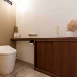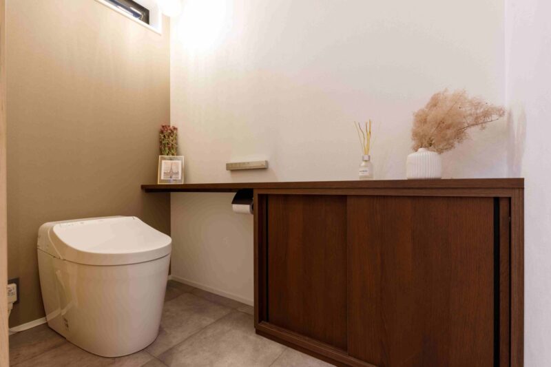 淡いベージュのクロスと木目の収納扉が調和するナチュラルモダンなトイレ。