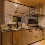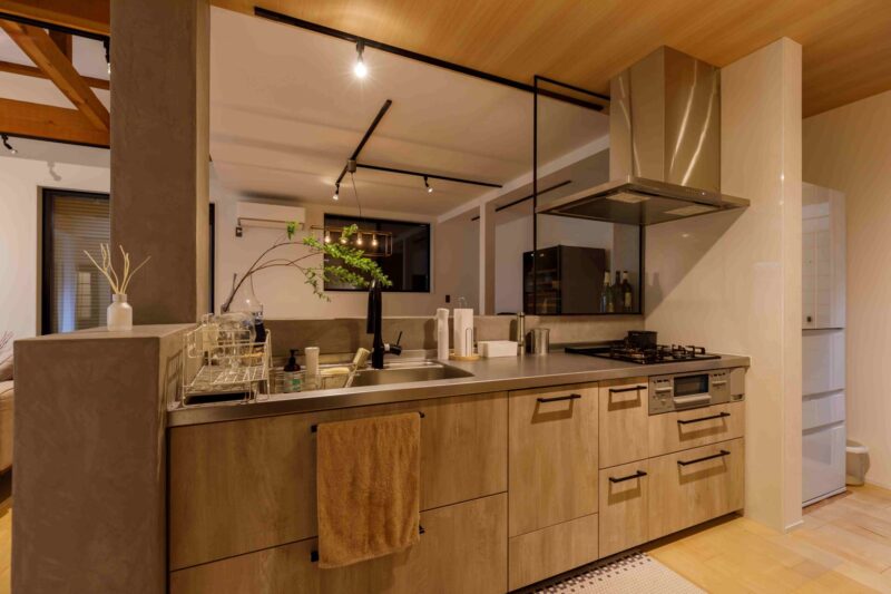 ステンレス天板と木目調キャビネットが美しく調和したデザインキッチン。