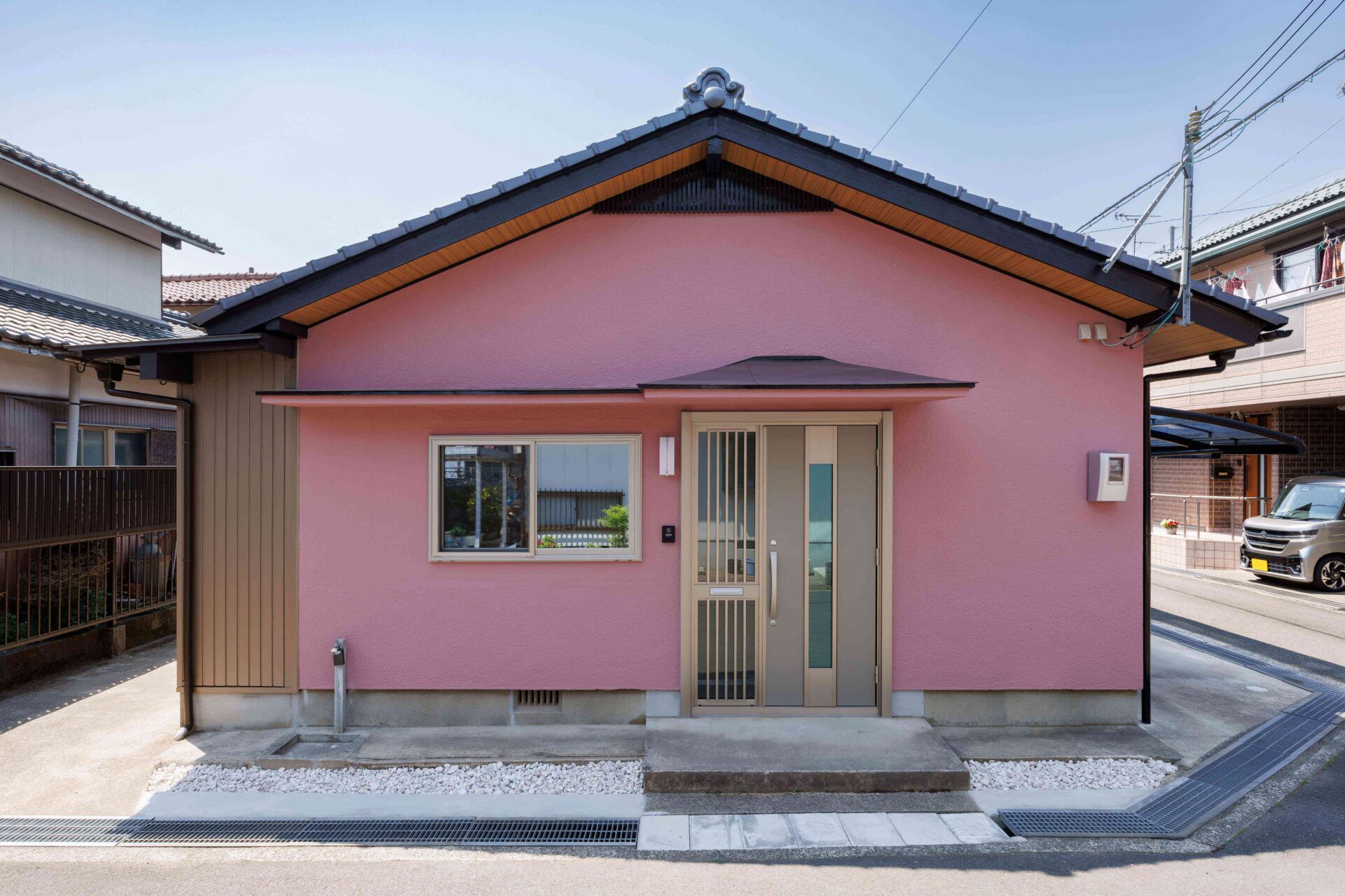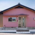 ピンクの外壁が印象的で、温かみと個性を感じられる外観です。