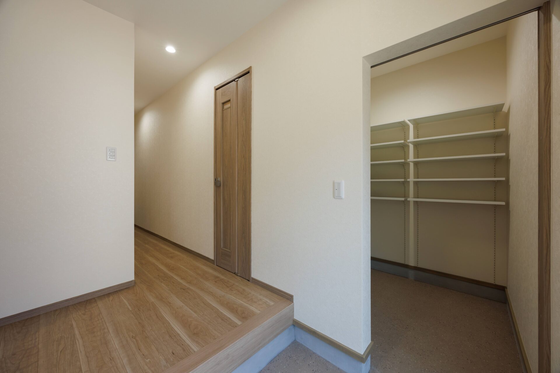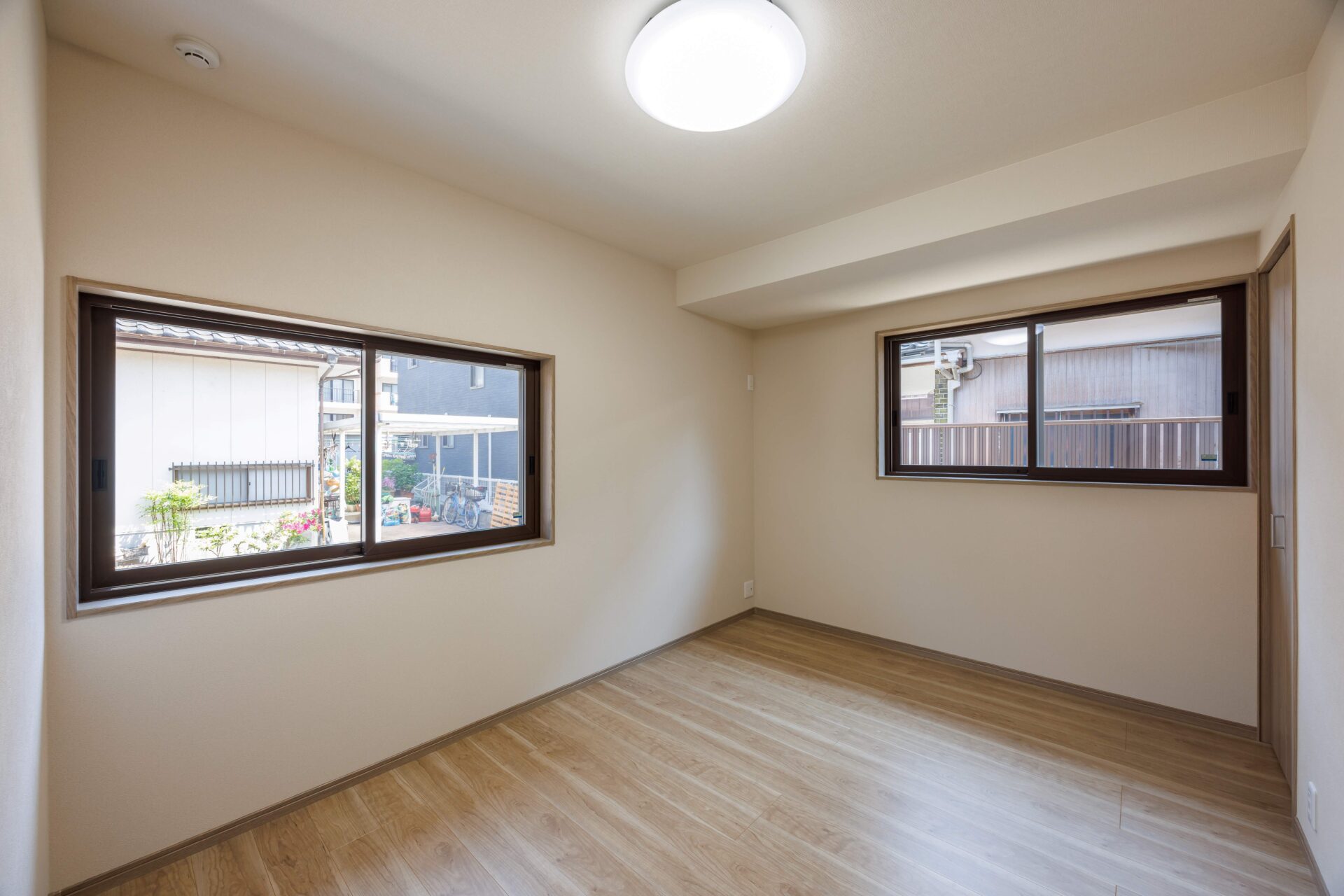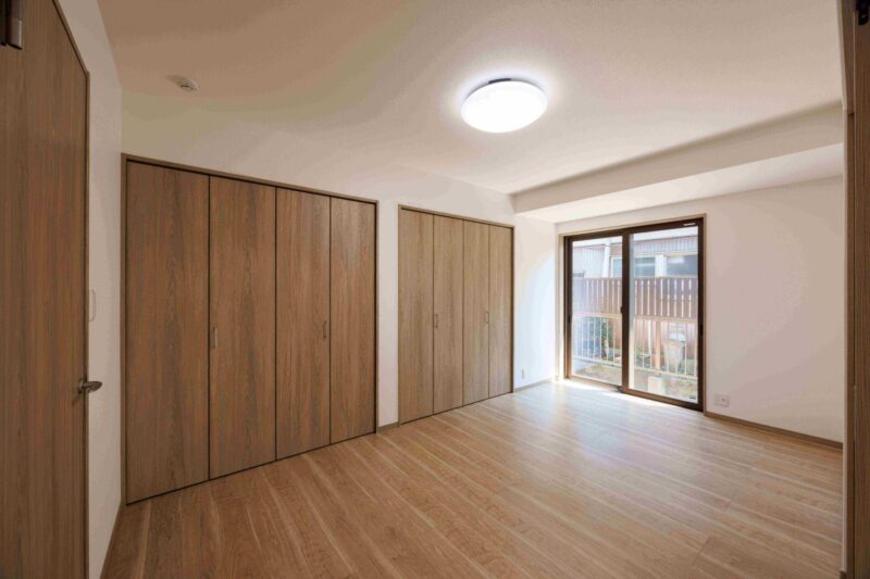 木目調の建具と床の統一感があり落ち着いた雰囲気です。大きなクローゼットを2つ完備で衣類や布団などたくさん収納できます。