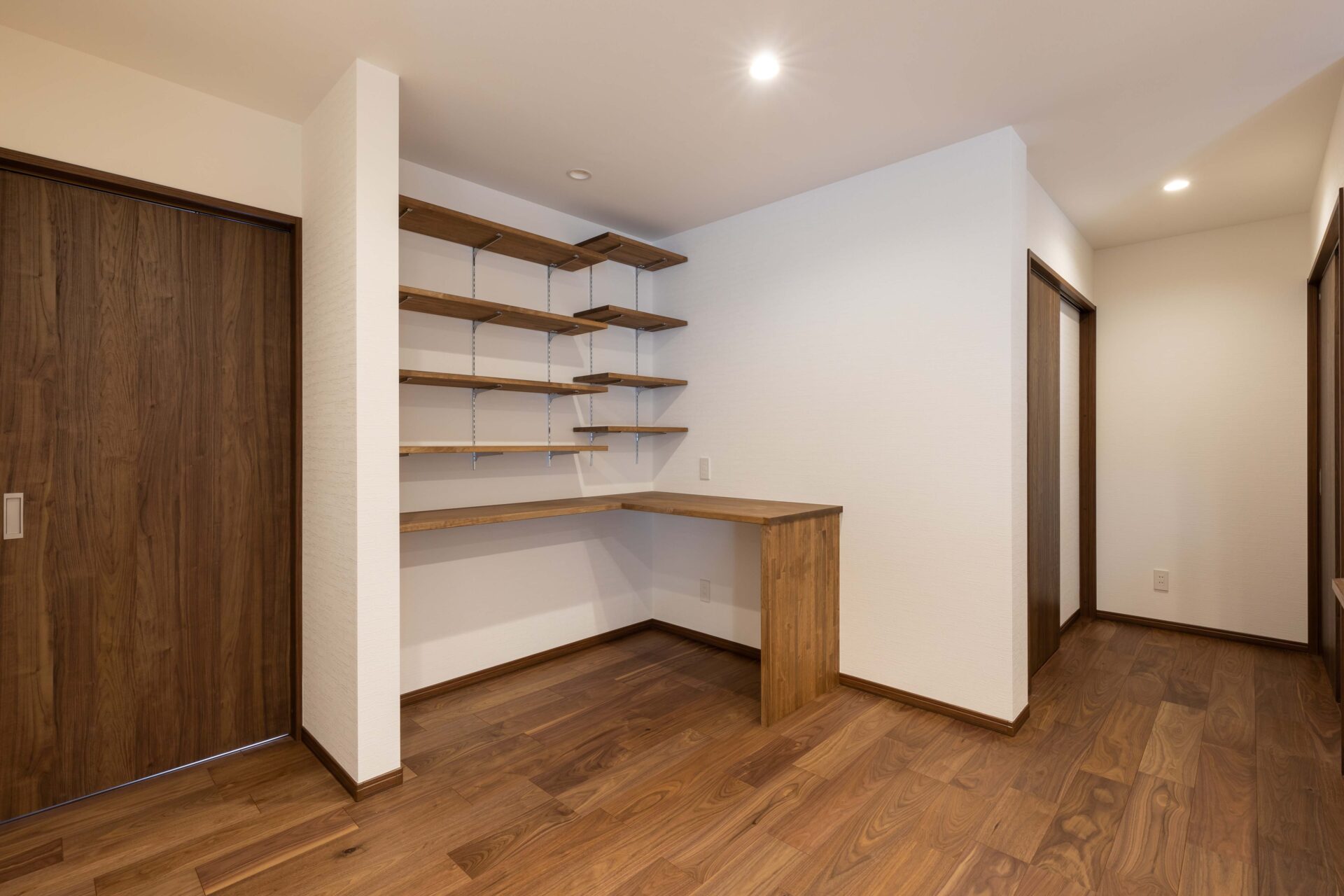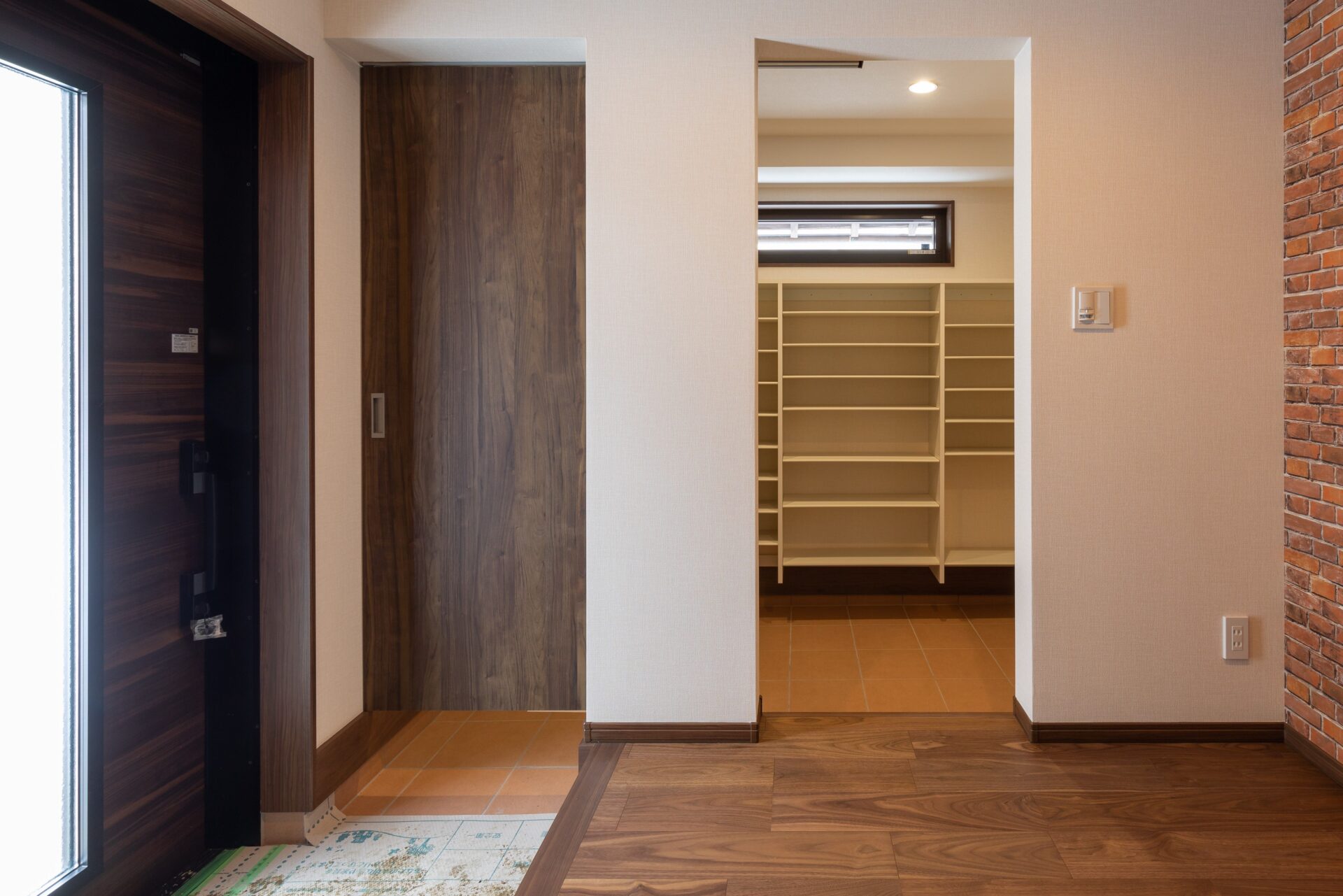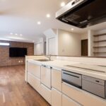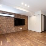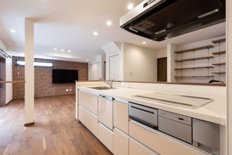 レンガ調のアクセントが映え、ウォールナット調のフローリングと相まって落ち着きと高級感のある空間です。